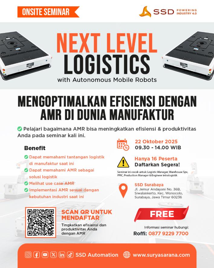 Ikuti seminar Next Level Logistics: Mengoptimalkan Efisiensi dengan AMR di Dunia Manufaktur.